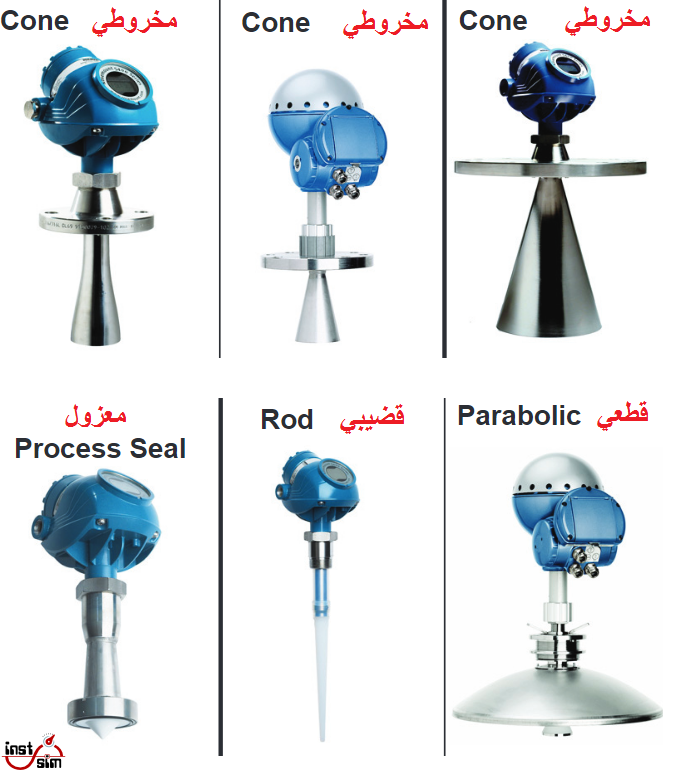 أنواع مختلفة من الهوائيات المستخدمة مع الجهاز الراداري لقياس المنسوب