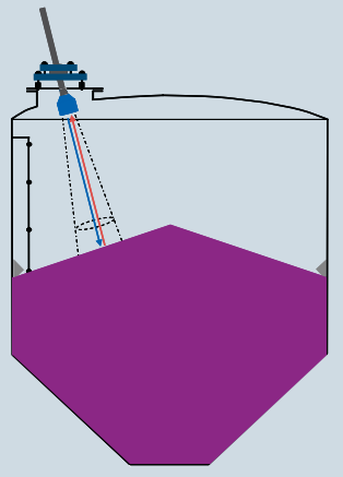 * For solids, perpendicular to the angle of repose. This usually means aiming the transducer toward the silo or bin outlet. (Figure 2).