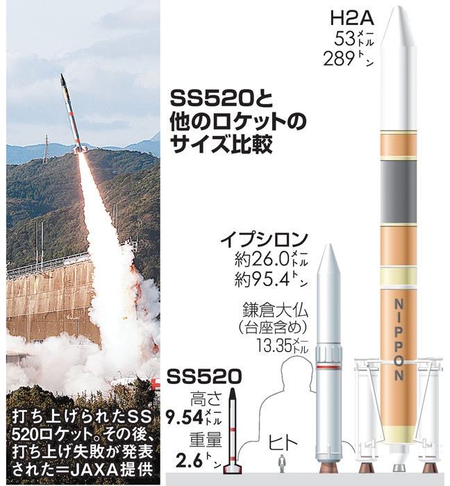The No. 5 vehicle of the SS-520 series carried a microsatellite weighing about 3 kilograms developed by the University of Tokyo to collect imagery of the Earth’s surface. The launch was aimed at verifying JAXA’s technology to send a small rocket made with commercially available components to the sky at lower cost amid growing global demand for microsatellites. The space agency used components found in home electronics and smartphones for the rocket. |