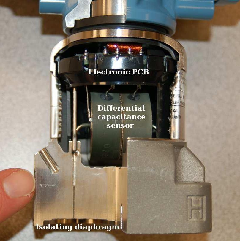 بالنسبة لتصميم الموديل Rosemount 3051C ، يتم تطبيق الضغط على الأغشية العازلة Isolating Diaphragms ، فيتسبب الزيت في انبعاج وسط الغشاء وبالتالي تتغير قيمة السعة الكهربية Capacitance . ثم يتم تحويل لإشارة السعة الكهربية Capacitance إلي إشارة رقمية في المحول C/D Converter .