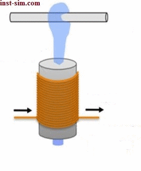 String effect on a single coil (electric guitar). The coil is connected to a multimeter that indicates the voltage changes when the string moves. This signal is normally sent to an amplifier.