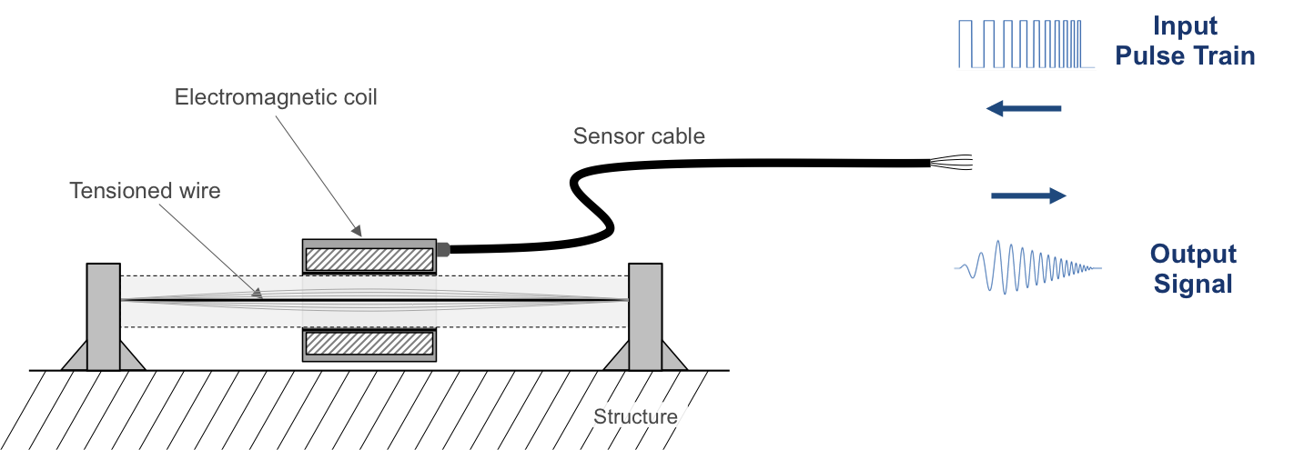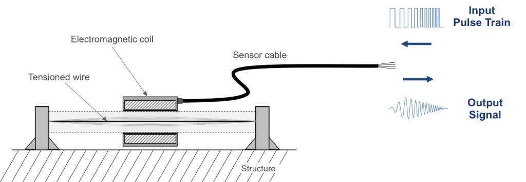Previous figure illustrates the basic components of a vibrating wire sensor. A tensioned steel wire, hermetically sealed, is coupled with an electromagnetic coil. The wire is “plucked, by applying momentary electrical pulses to the coil, inducing vibrations in the wire. The wire will settle to it’s resonant vibrating frequency, and these vibrations in turn induce current back onto the signal wires. This signal can then be measured and used to determine the tension in the wire, and therefore also the strain in the structure to which the vibrating wire gage is attached. [Source]