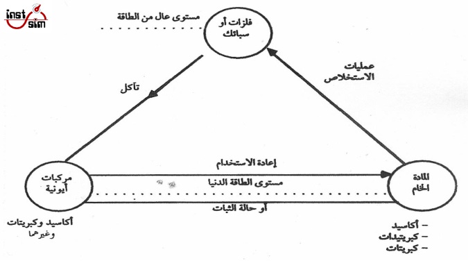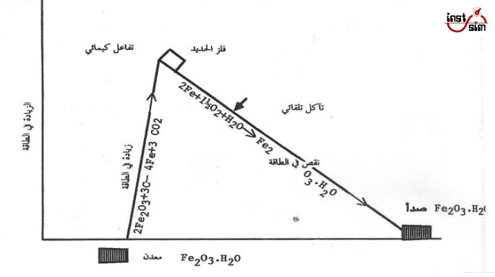 يمثل هذا المخطط التغير في الطاقة أثناء الاختزال الكيميائي لأكسيد الحديد (الهيماتيت) إلى فلز الحديد و تآكل الحديد في وجود الأكسجين وبخار الماء وتحوله إلى الصدأ، والذي يمثل المعدن الأول قبل استخلاص فلز الحديد .