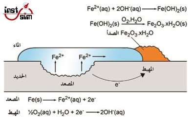 - ينتج تآكل الحديد أو ما يعرف باسم الصدأ ، عندما تتفاعل الإلكترونات الحرة علي سطح المعدن مع العوامل الجوية حيث تتحول إلى مركبات أكسيدية مما يؤدي إلى فقدان الحديد للمعانه و بريقه ويحدث تآكل سطحي له. و يشكل صدأ الحديد مشكلة صناعية واقتصادية كبيرة في العمليات والمنشآت الصناعية المختلفة.