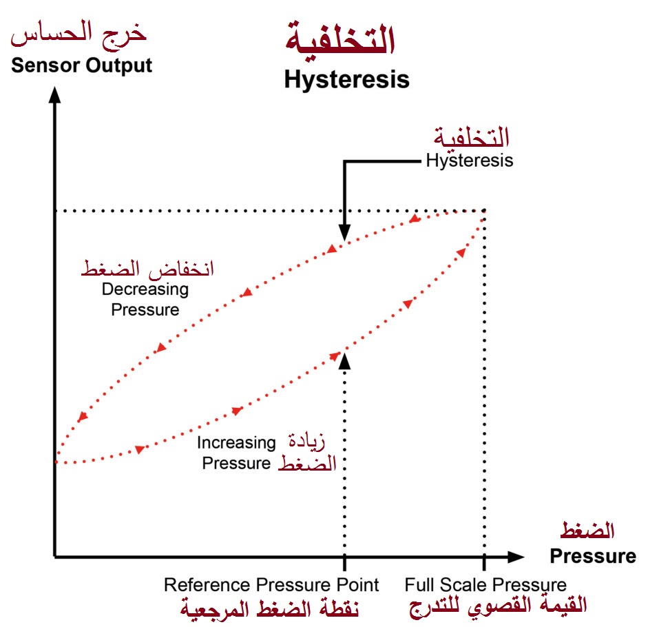 يتم التعبير عن خطأ التخلفية Hysteresis Error كنسبة موجبة أو سالبة من مدي القياس Range لحساس الضغط .