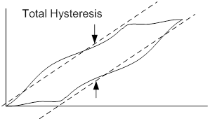 Hysteresis is the measurement of the difference in Y offset of the values generated by the transducer as it measures in a positive going direction, and the same values as the transducer measures back down toward zero( the negative going values).