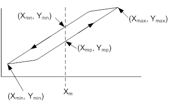 The calculation of the hysteresis in this simplified condition occurs at the X midpoint of the curve. This point can be located with the following formula.